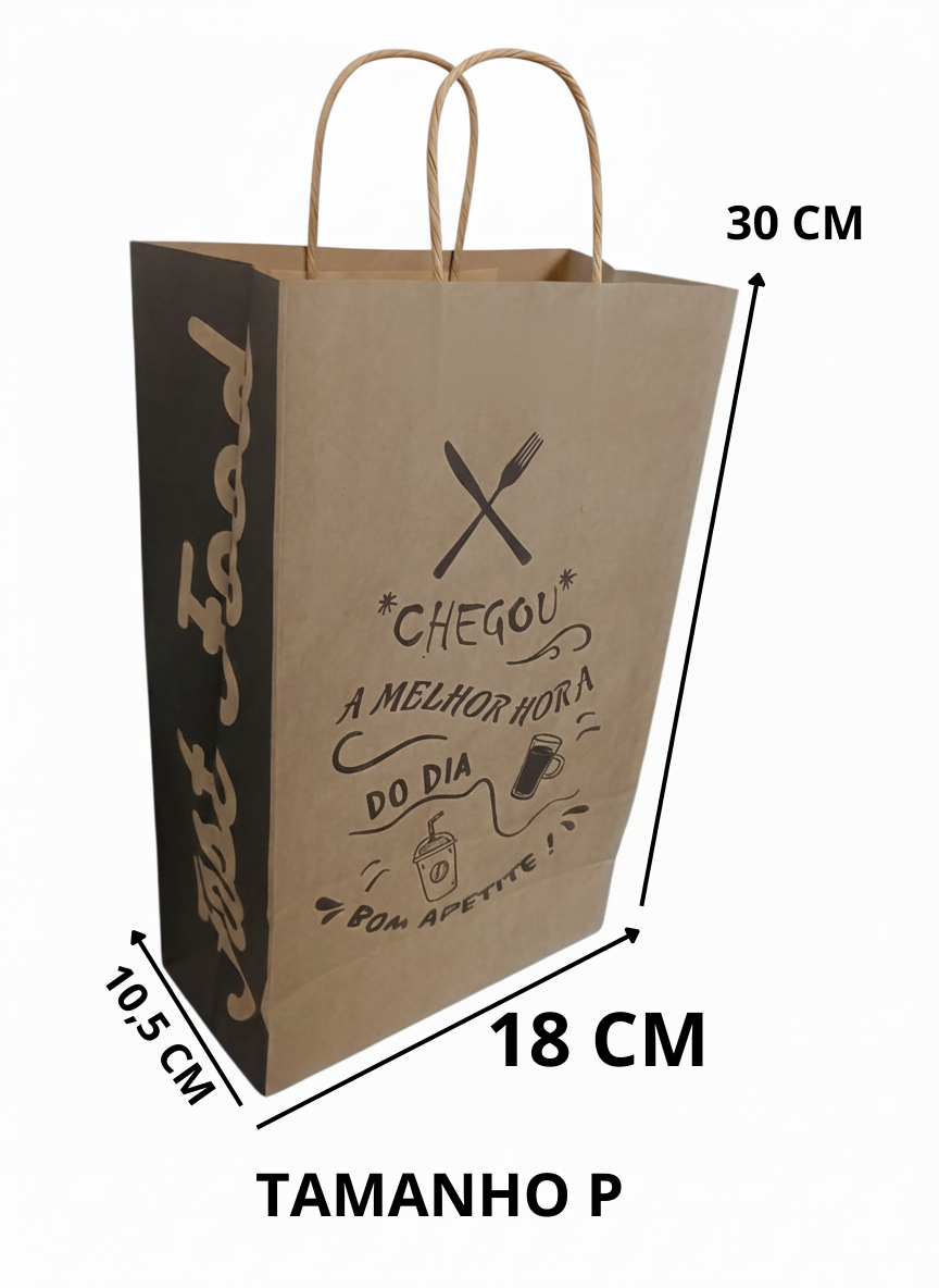 sacola com 50 de papel Kraft, no Tamanho P, perfeita para entregas de pedidos menores de delivery. Possui as dimensões 18x30x10,5 alça 9 cm